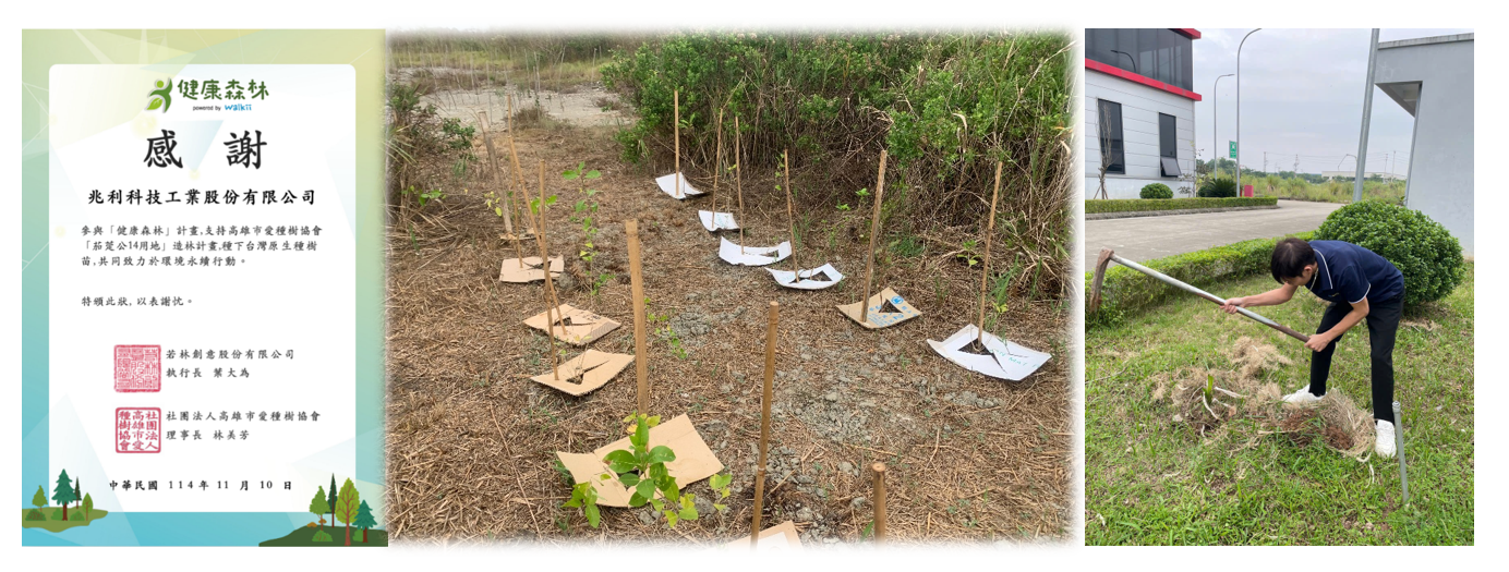 兆利科技總部在2025年舉辦「健走、減碳、植樹」活動,透過兩梯次健走行動,累計約900萬步、換算6.4萬公里,成功累積11棵植樹額度,並於11月在高雄茄萣濕地完成樹苗種植,將同仁的日常行動轉化為具體的環境貢獻。同時,兆利科技越南廠亦推動「植樹造綠,共築永續家園」綠色行動,號召同仁於廠區內外種植樹苗與花卉,共同為減緩氣候變遷盡一份心力。